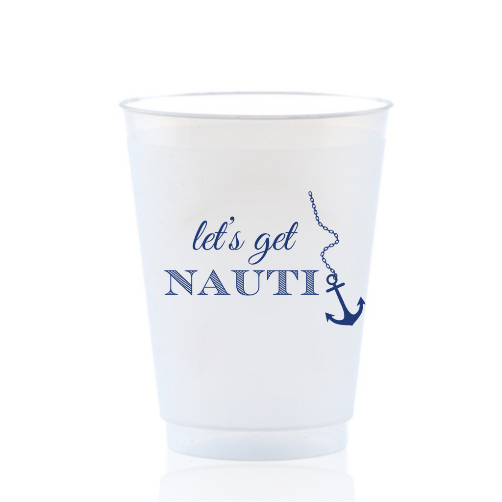 Ready to make some waves? Our "Let's Get Nauti" drinking cups are the ultimate accessory for your nautical themed party, Last Sail Before the Veil, Last Toast on the Coast bachelorette, beach house, birthday bash, or other fun occasion. Let's raise some anchors (and maybe some eyebrows), as we add a little touch of mischief to your party. These versatile, frost flex transparent cups are easy to enjoy both inside and outside, are BPA free, and can be enjoyed for years to come.