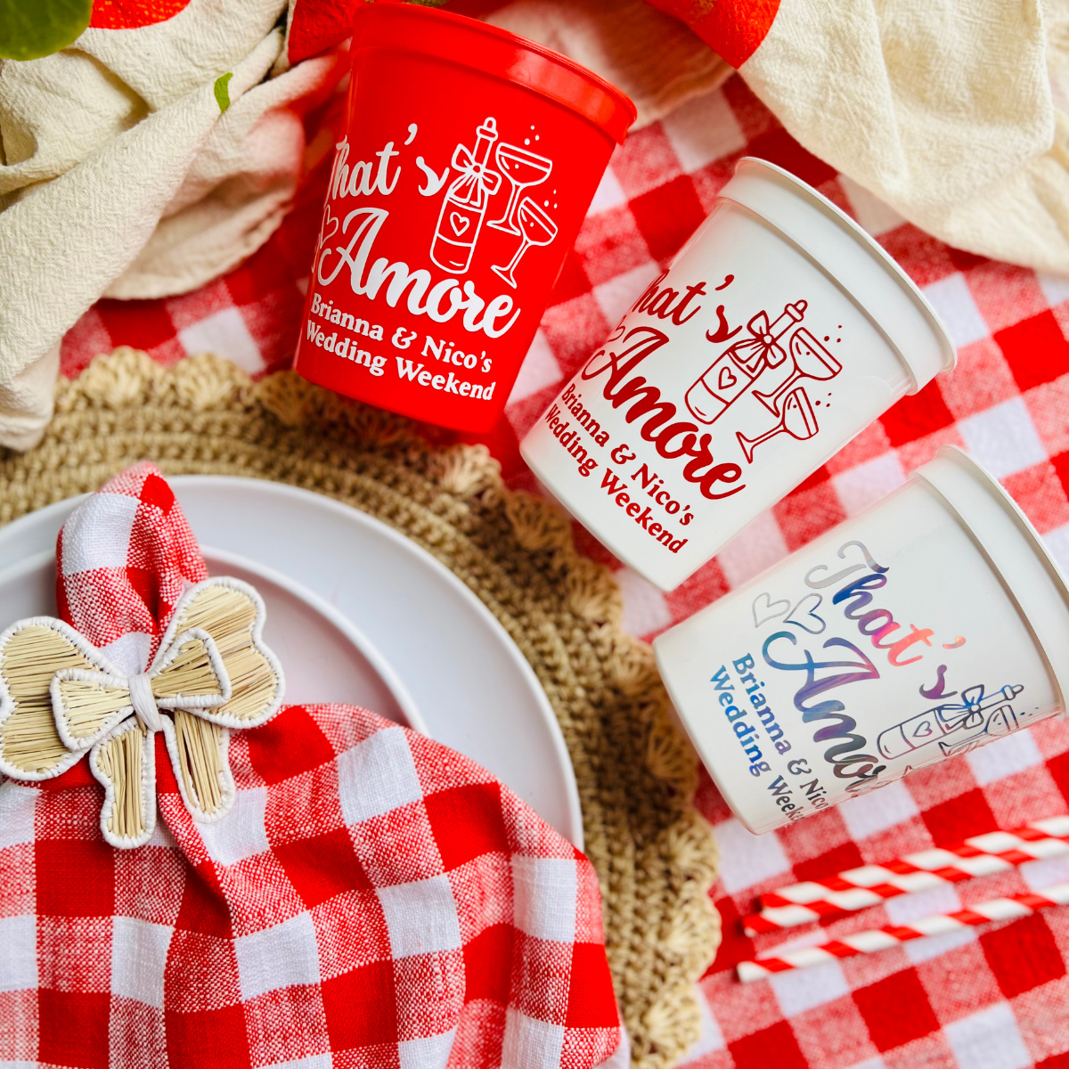 Whether you're hosting a pizza-and-prosecco night, a limoncello welcome party, or a full wedding weekend celebration, our "That's Amore" custom wedding cups bring the theme together in the sweetest way.