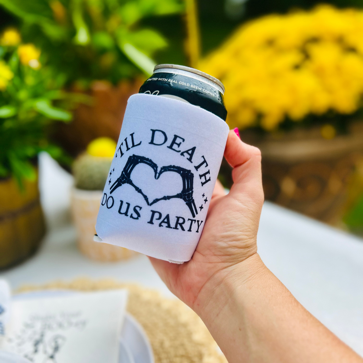'Til death do us...party! Haunt the night in style with our creepy-cute "Til Death Do Us Party" can coolers that are perfect for keeping drinks cool while spirits stay high!